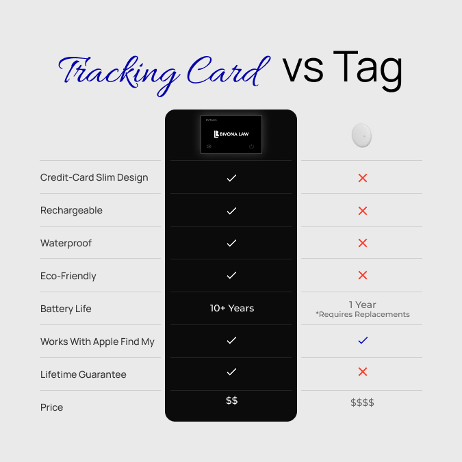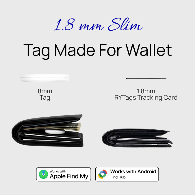 Smart leather wallet tracking card with real-time tracking. Works with iOS & Android, slim design, rechargeable battery and long tracking range.